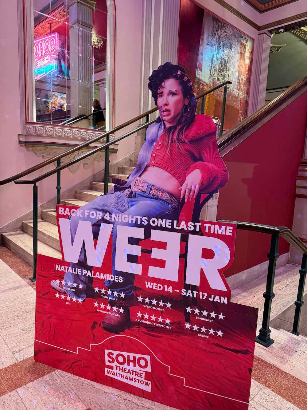 First theatre trip of the year was Soho Theatre Walthamstow. WEER (rhymes with “deer”) stars Natalie Palamides simultaneously as her male/female characters. With costumes and make up split down her centre, she physically jumps to present whichever half is speaking to the audience. Initially unconvinced by the concept, Palamides’ sheer energy and comedy props won me over. The male character is repulsive - but you realise he needs to be, otherwise it wouldn’t be so funny.